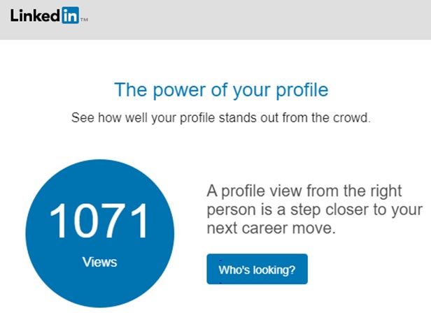 Here is a look at my profile results for the week of July 22nd. I am constantly monitoring and tracking my results to better understand what keywords work better than others. A simple change in keywords meant that 150 NEW people were exposed to my profile last week. That’s a good thing! Knowing that many thousands of searches are happening on LinkedIn each day, the targeted use of keywords will increase the number of times your LinkedIn profile shows up in a buyer’s search results. When people find you, your chances of being able to engage with them increases!